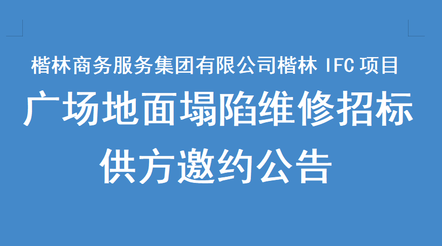 楷林商務(wù)服務(wù)集團(tuán)有限公司鄭東新區(qū)分公司楷林IFC項(xiàng)目廣場(chǎng)道路塌陷維修招標(biāo)供方邀約公告我公司擬就鄭東新區(qū)分公司所屬物業(yè)服務(wù)項(xiàng)目的廣場(chǎng)道路塌陷維修工程招標(biāo)進(jìn)行邀請(qǐng)報(bào)名,茲邀請(qǐng)有相關(guān)資質(zhì)的優(yōu)質(zhì)供應(yīng)商前來報(bào)名投標(biāo)?,F(xiàn)將有關(guān)事項(xiàng)說明如下:一、項(xiàng)目名稱