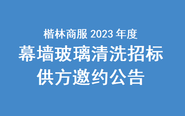 楷林商服2023年度幕墻玻璃清洗招標(biāo)供方邀約公告我公司擬就2023年度幕墻玻璃清洗招標(biāo)進(jìn)行邀請報(bào)名,茲邀請有實(shí)力的相關(guān)優(yōu)質(zhì)供應(yīng)商前來報(bào)名投標(biāo)?,F(xiàn)將有關(guān)事項(xiàng)說明如下:一、項(xiàng)目名稱:楷林商服2023年度幕墻玻璃清洗招標(biāo)供方邀約二、邀約主體:楷林